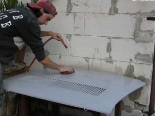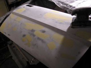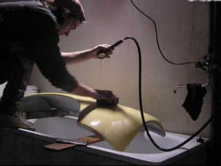 ![]() Přebroušený povrch, maximálně rovný, nastříkáme plničem. To je akrylátový základ pod lak. Zabrání vpíjení laku do kitu. Plnič si vyberte ve vhodné barvě, dělá se například žlutý a šedý.